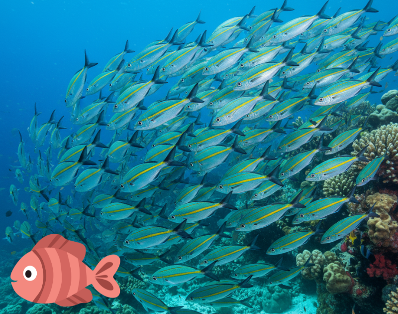 また、サンゴ礁の隙間に隠れたり、群れで行動したりする魚も多く、そのために派手な色が目印になることもあるようです。