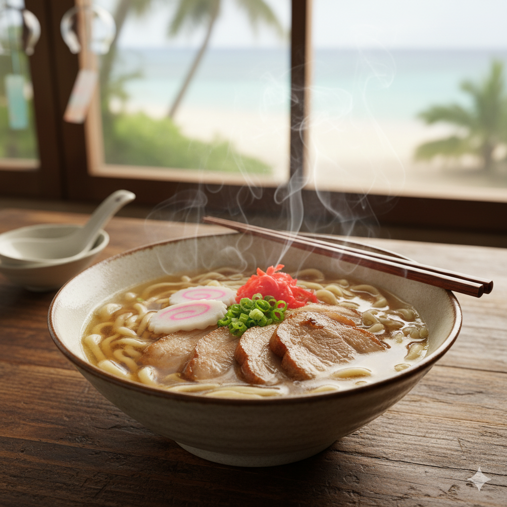 具材には、じっくり煮込んだ三枚肉(豚の角煮)、かまぼこ、紅しょうがなどが定番で、テーブルには欠かせないコーレーグス(島とうがらしの泡盛漬け)を加えて辛さを楽しむのが沖縄流です。
