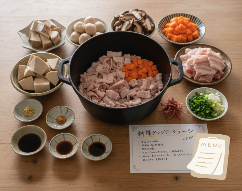 • 具を切る・炒める:芋・豚肉・にんじん・しいたけなどを食べやすい大きさに切り、少量の油で軽く炒めます。炒めることで香りが立ち、旨みが全体に広がります。