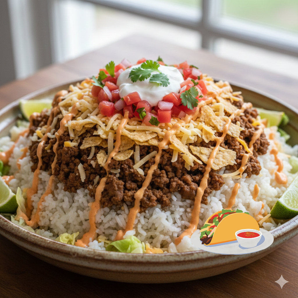 タコライスは、タコスの具材であるスパイシーなタコミートやチーズ、レタスなどをご飯の上に乗せ、特製ソースをかけて食べる斬新なメニューです。