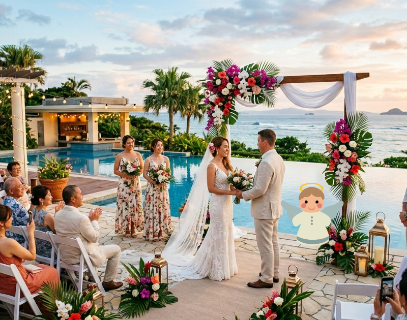 - 圧倒的な景観:どこを切り取っても絵になる海と南国の光が二人を包みます。
