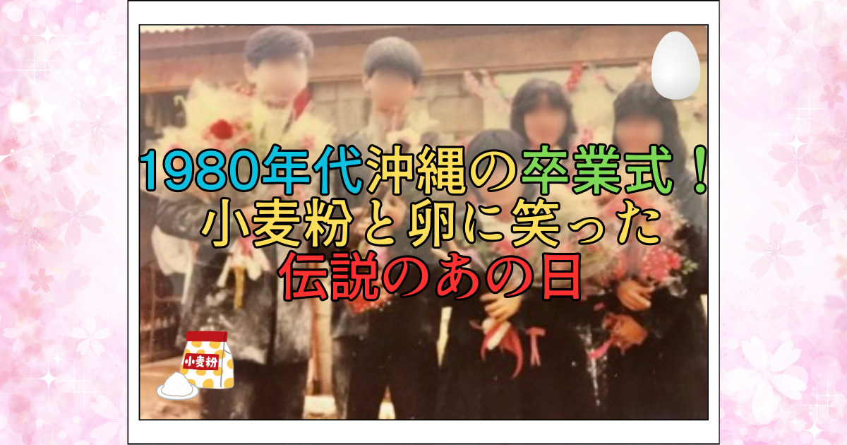 1980年代の沖縄の卒業式は、厳かな式典と、その後の小麦粉・卵の嵐という強烈な対比で成り立っていました。生徒も先生も一緒になって粉まみれになる姿は、当時の大らかな沖縄の空気感を象徴しています。